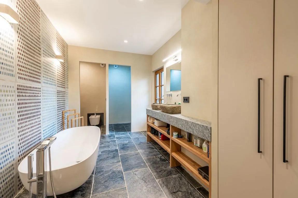 À l’intérieur, un dialogue subtil s’installe entre éléments anciens et écritures contemporaines : charpente apparente, matériaux bruts et textures naturelles côtoient des lignes épurées, du mobilier intégré et des choix décoratifs maîtrisés.