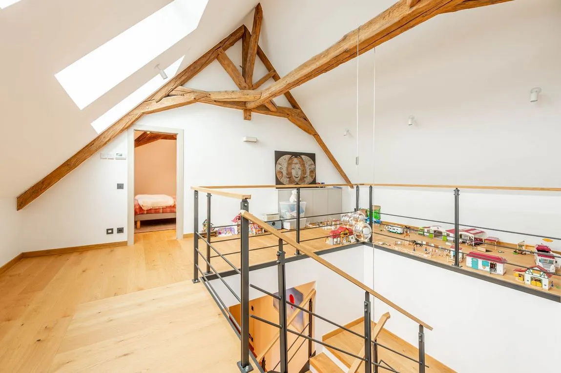 La belle hauteur sous plafond est mise en valeur par la création de poutres et solives intermédiaires en bois, imitant les plafonds à la française.