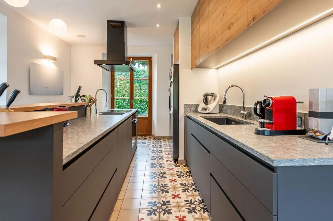 La cuisine, pensée comme un cœur de vie, illustre particulièrement ce travail d’équilibre entre authenticité et modernité, avec un jeu de matières riche et assumé.