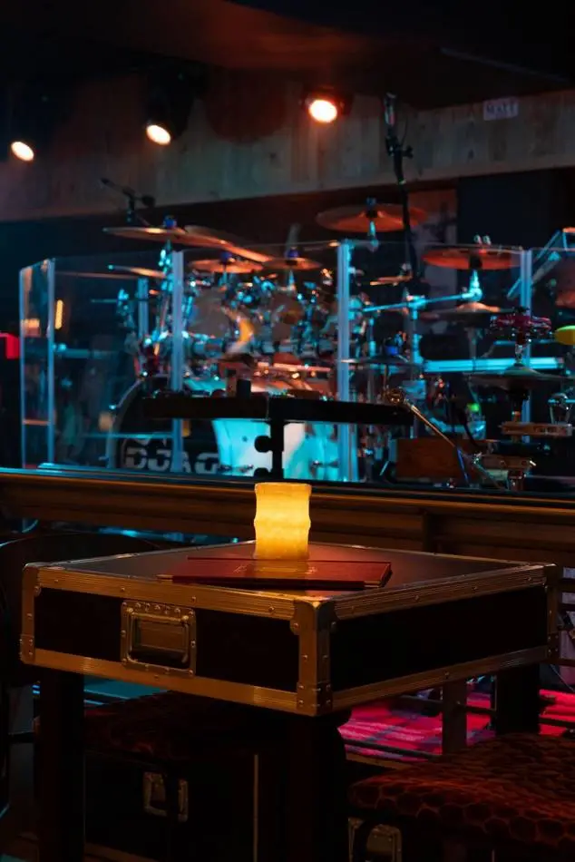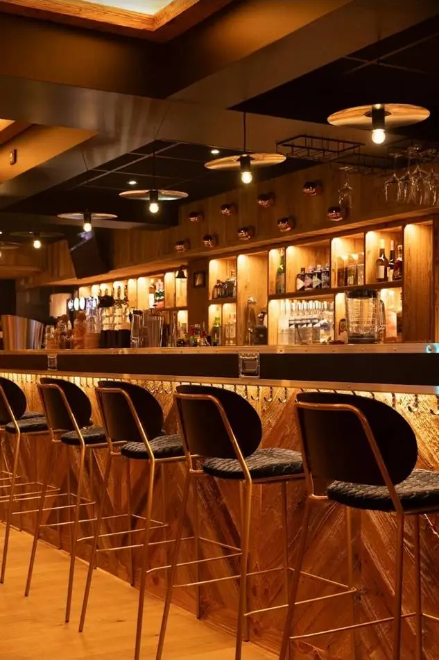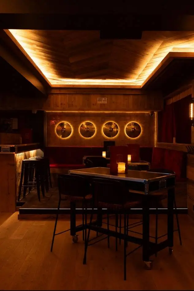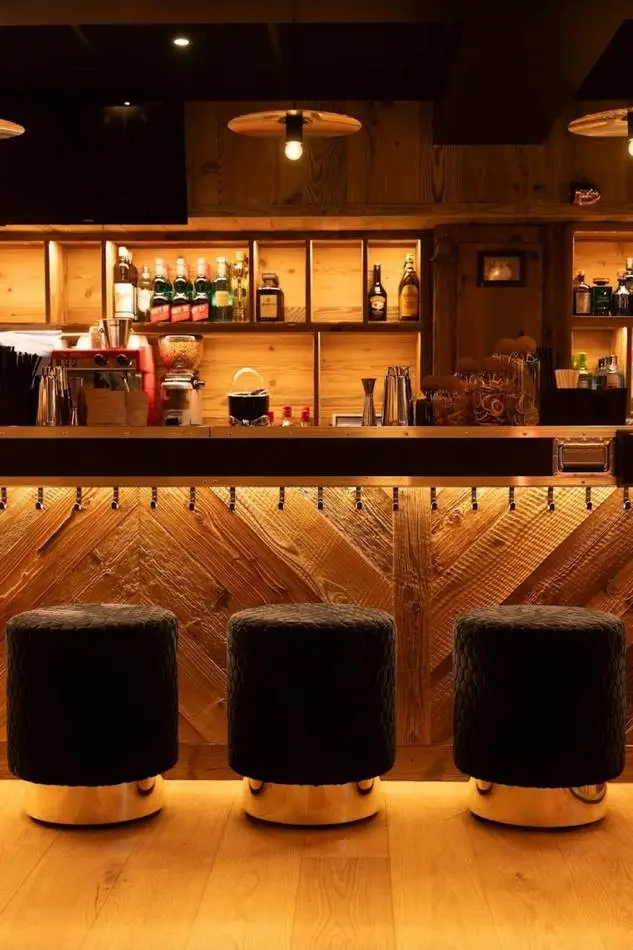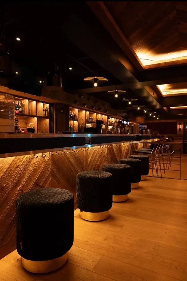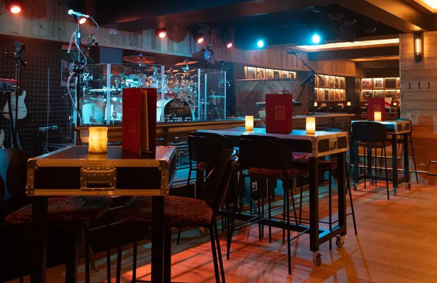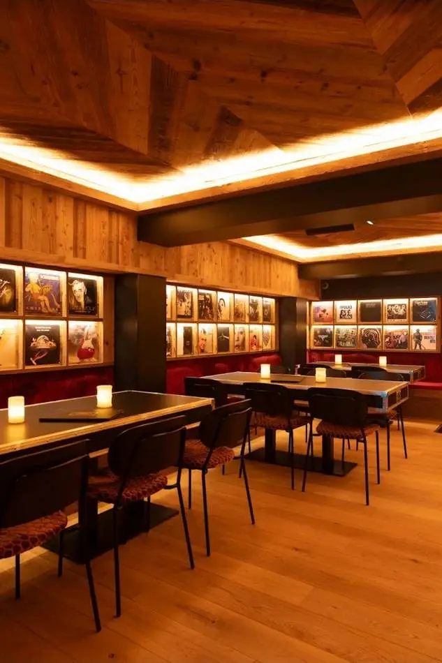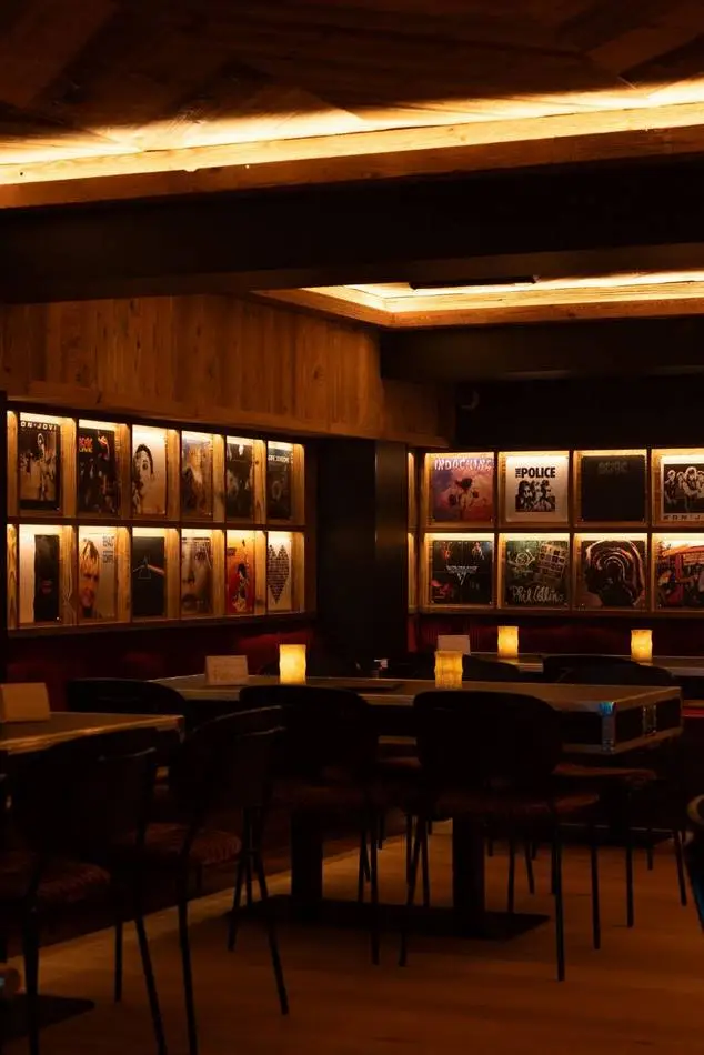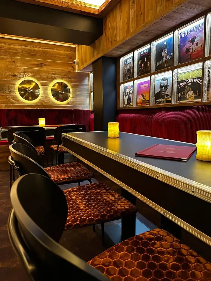L’identité du projet s’appuie sur un langage fort, entre univers montagne et culture rock. Bois, matières brutes et lumières contrastées dialoguent avec des références directes à la scène musicale : tables et bar en flight cases, vinyles rétroéclairés en composition murale, luminaires détournés : cymbales, tambours comme autant de clins d’œil à l’univers live.