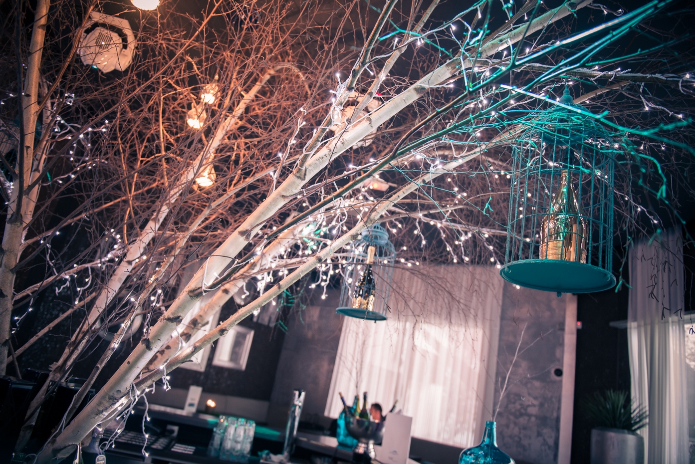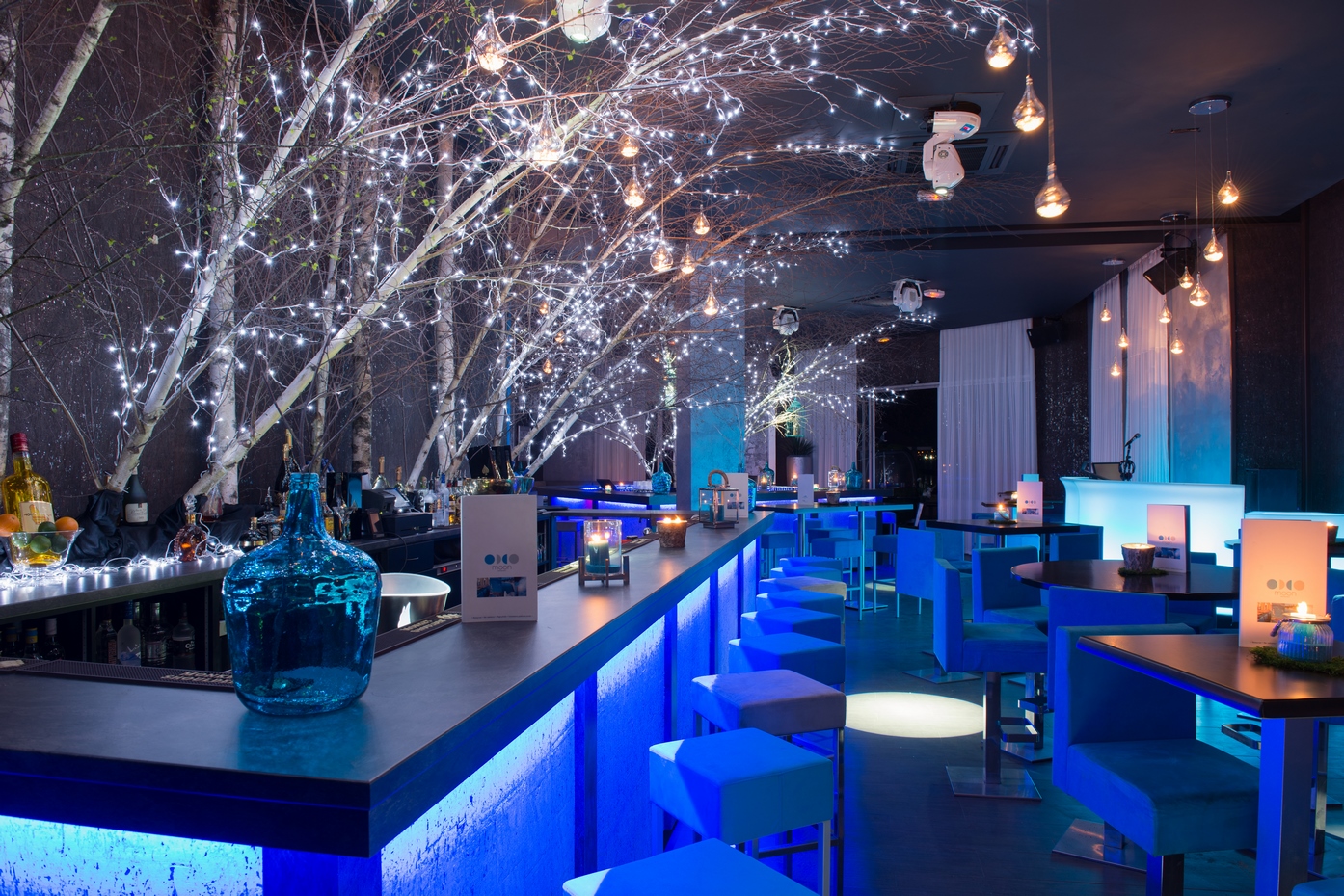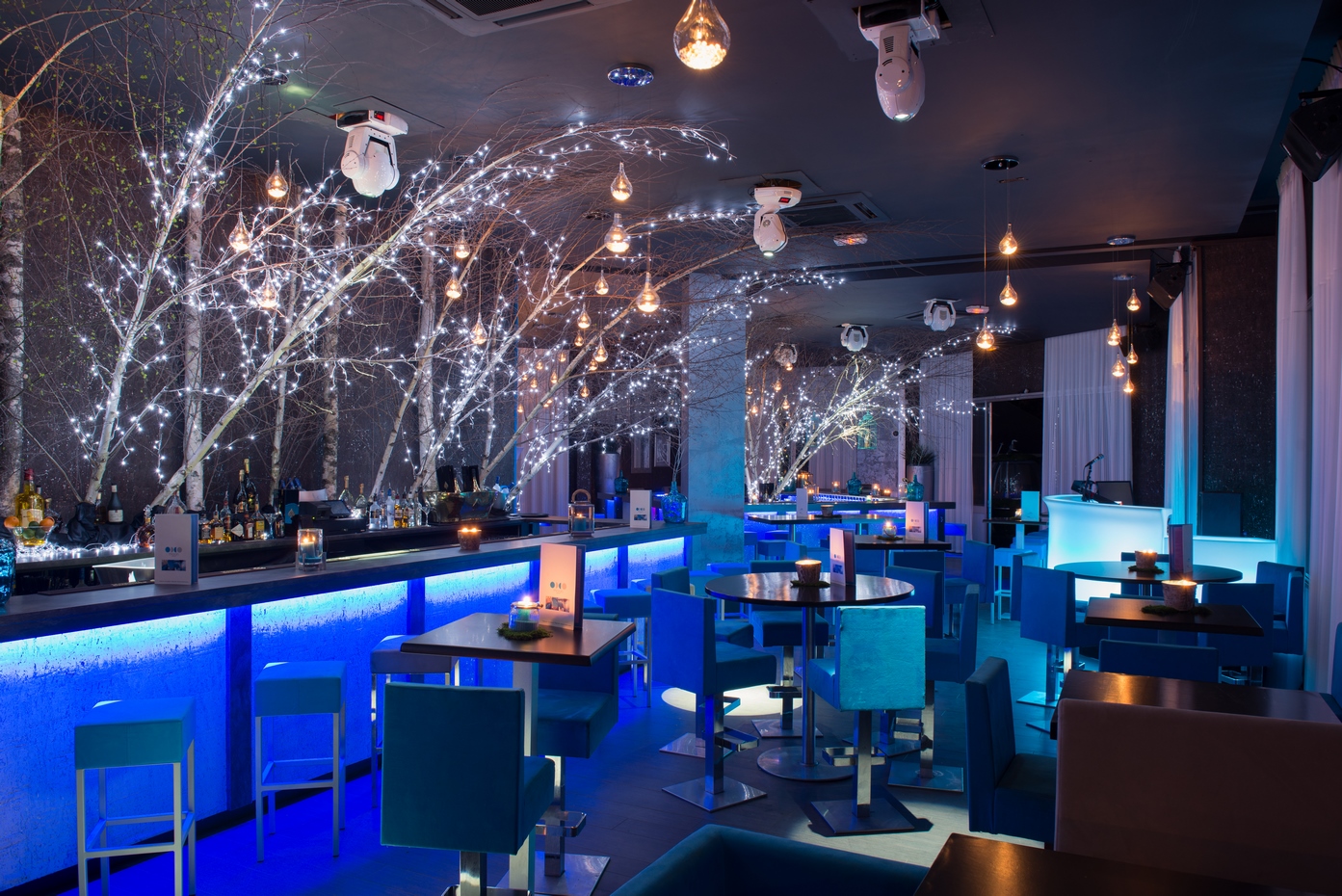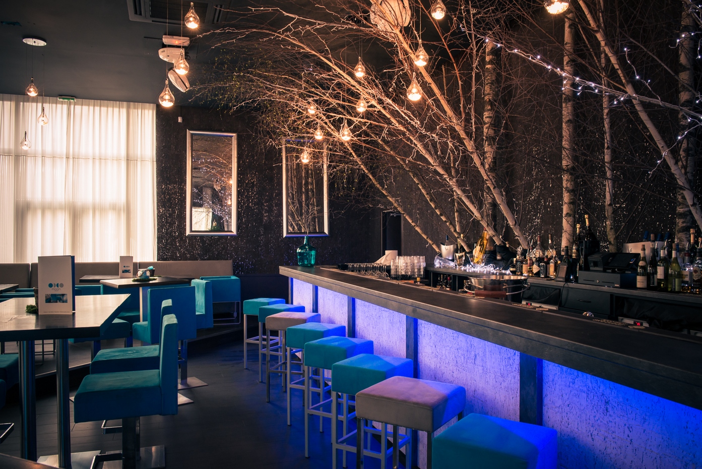 Une évolution fut demandée quelques années plus tard pour renouveler l’ambiance et apporter une réponse aux nouvelles contraintes d’exploitation du lieu évoluant avec son temps. Un ton résolument nature fut choisi avec l’intervention des ces bouleaux blancs en arrière-bar. Les revêtements muraux furent également changés pour venir sur un papier peint en écorce d’arbre blanc et marron pour définr les volumes en gardant notre ligne déco. Le mobilier fut changé et un deuxième bar fit son apparition pour répondre à la demande client. Des changements de luminaires en goutte d’eau apportèrent la dernière touche nature au projet.