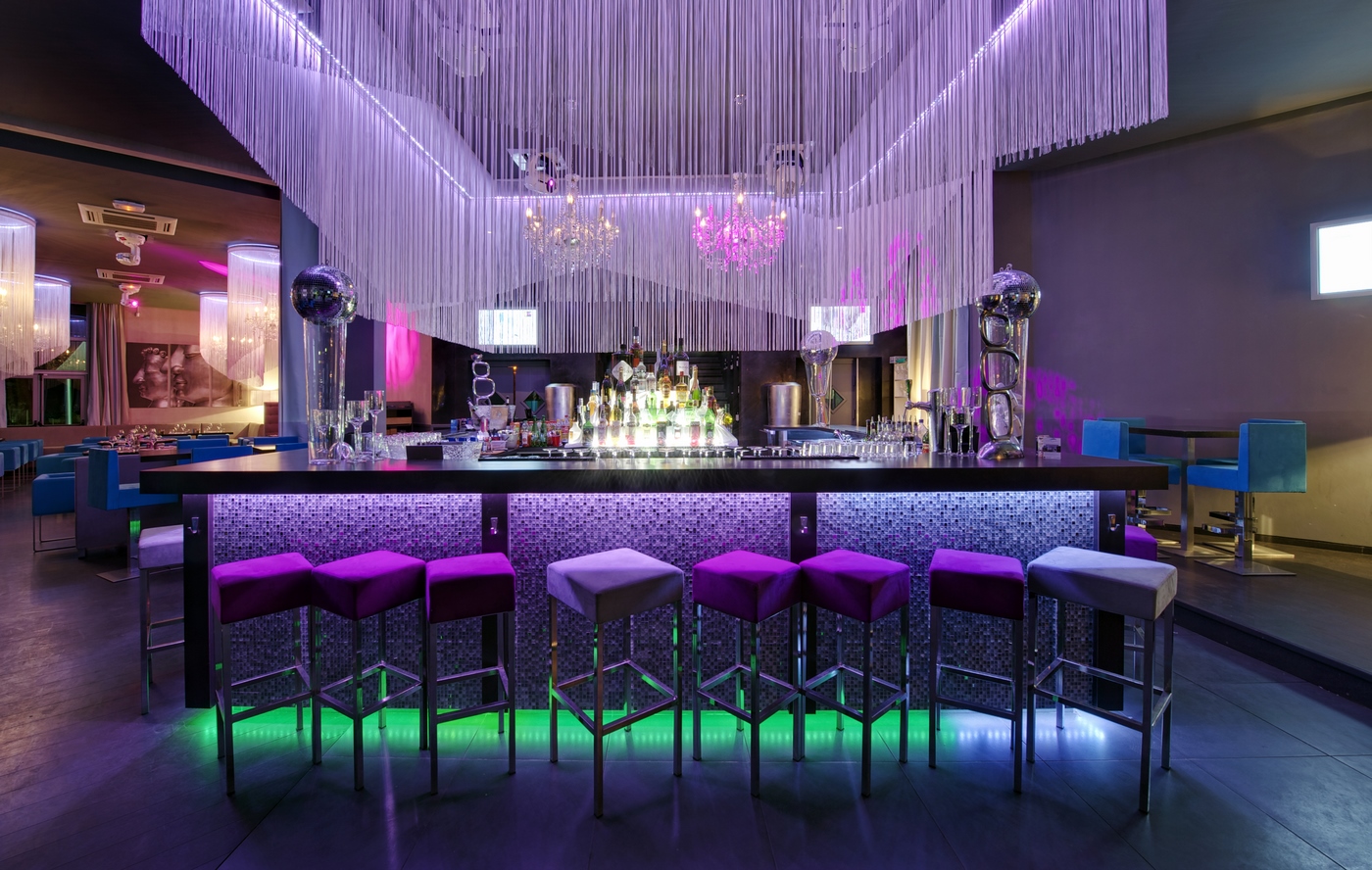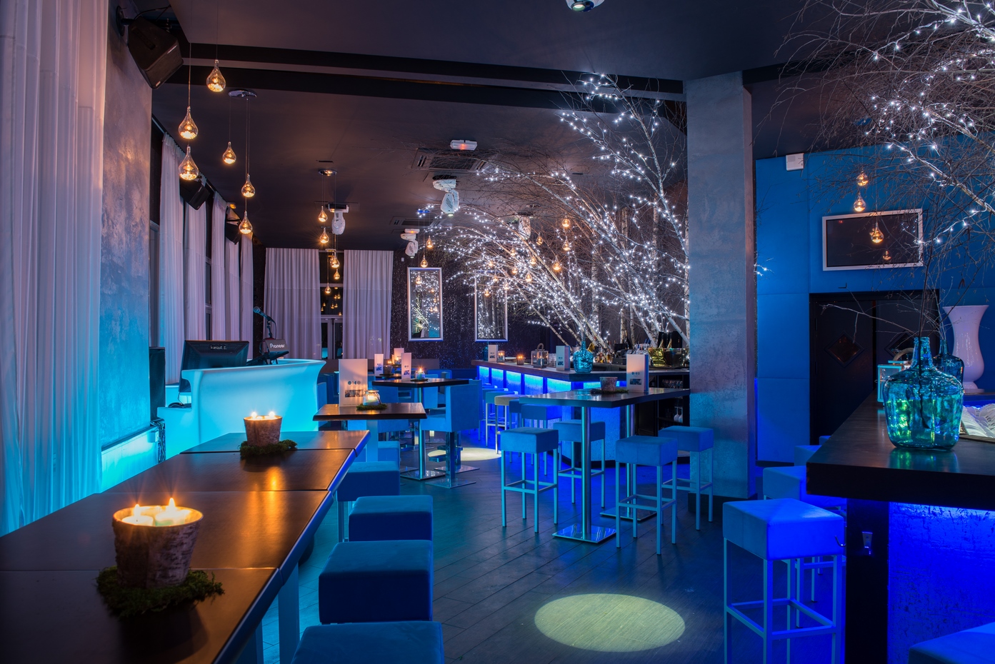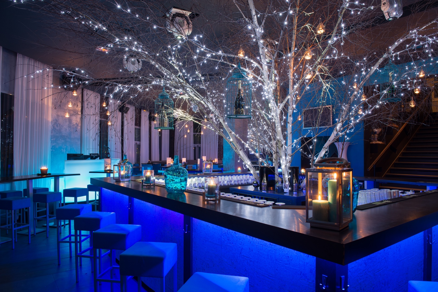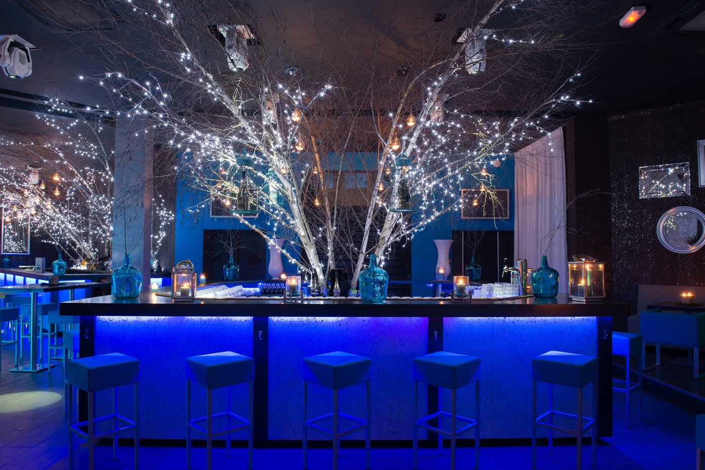 Une évolution fut demandée quelques années plus tard pour renouveler l’ambiance et apporter une réponse aux nouvelles contraintes d’exploitation du lieu évoluant avec son temps. Un ton résolument nature fut choisi avec l’intervention des ces bouleaux blancs en arrière-bar. Les revêtements muraux furent également changés pour venir sur un papier peint en écorce d’arbre blanc et marron pour définr les volumes en gardant notre ligne déco. Le mobilier fut changé et un deuxième bar fit son apparition pour répondre à la demande client. Des changements de luminaires en goutte d’eau apportèrent la dernière touche nature au projet.