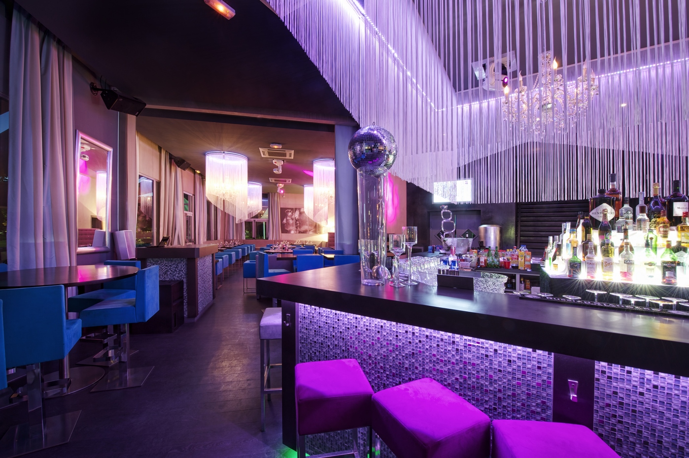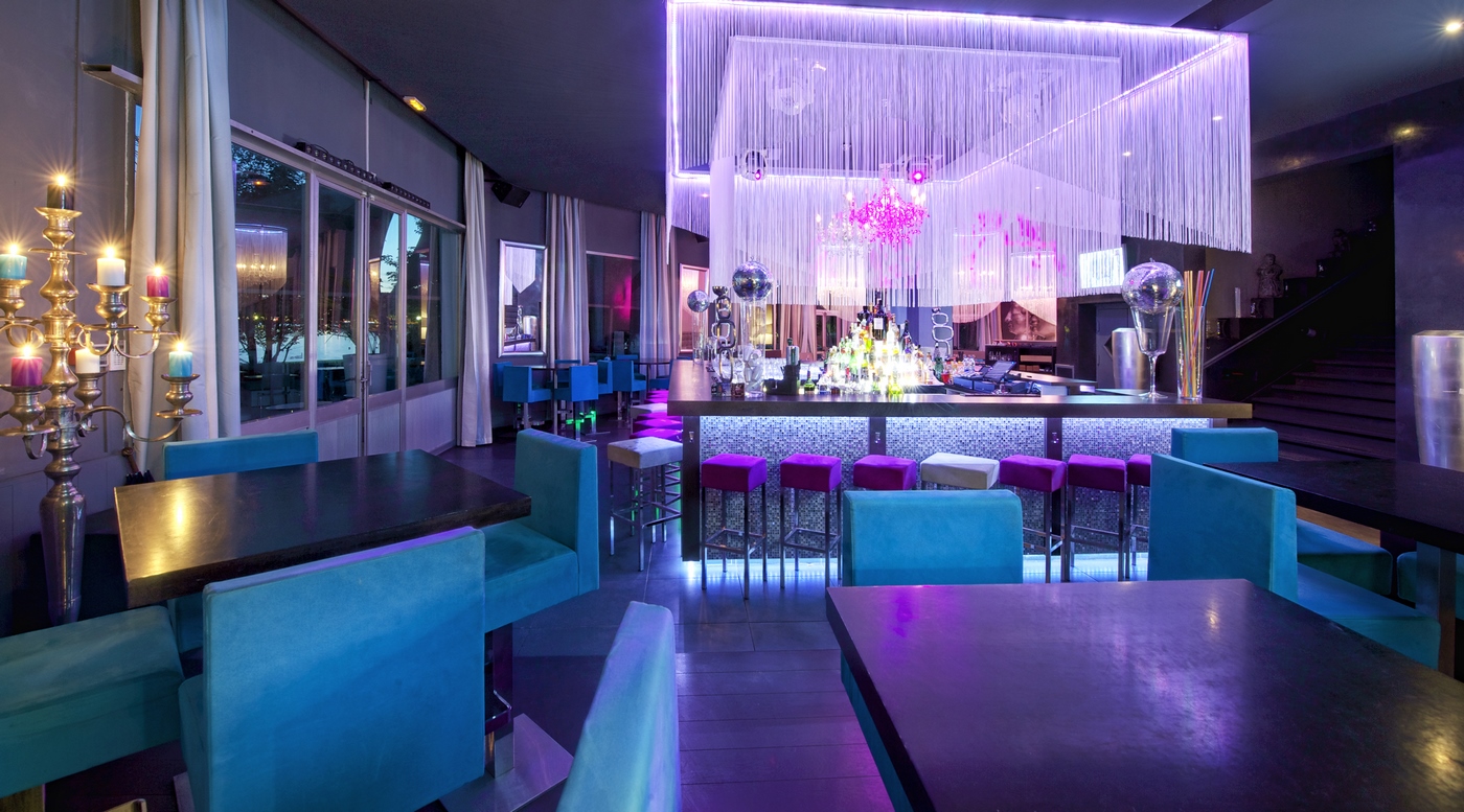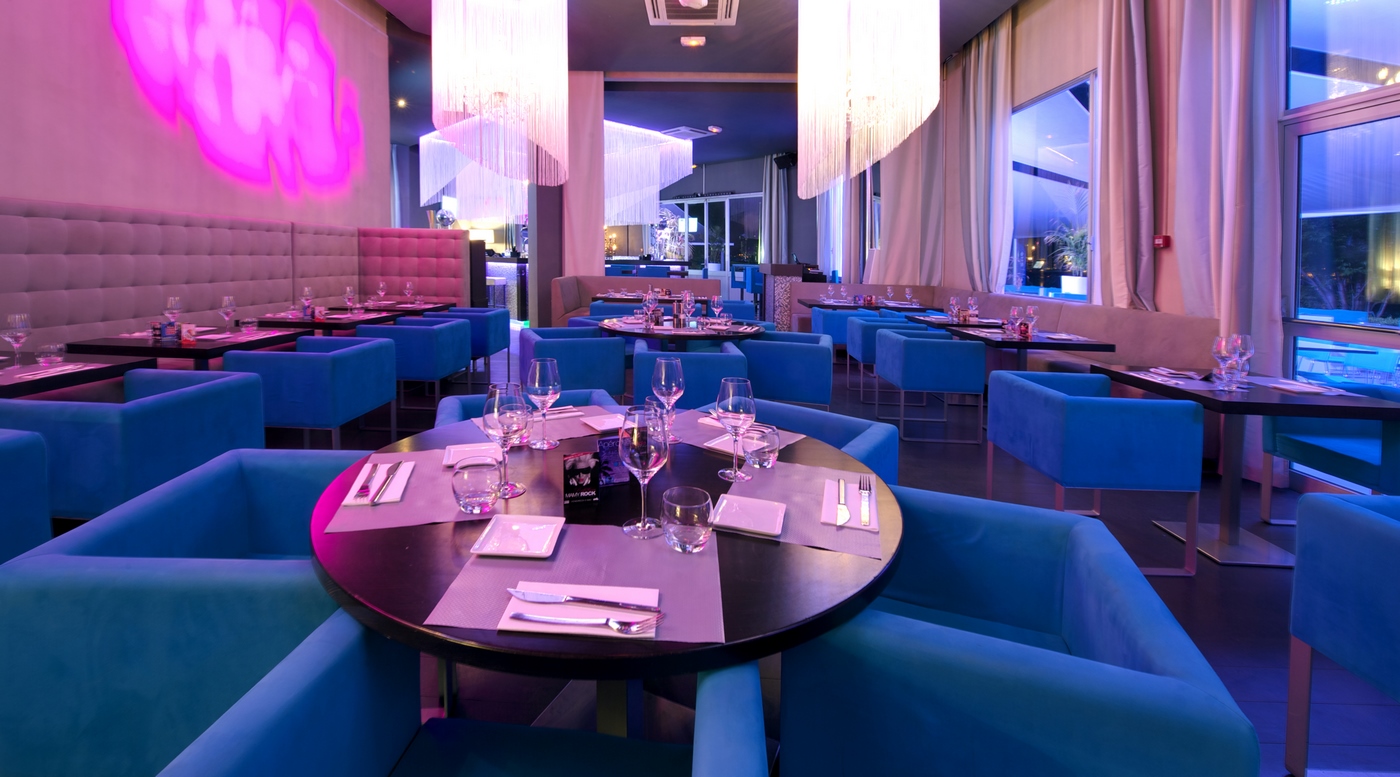 Ces suspensions en rideaux de fils remplir leur rôle de délimiter les espaces, entre autre celui du bar et en même temps compartimenter les volumes en réduisant l’effet de hall du restaurant. Tout le mobilier fût dessiné par nos soins et réalisé sur des tons bleu pastels, repris pour la terrasse extérieure. La terrasse extérieure vu son emplacement avait besoin d’ombrage et nous avons créé un système de toile suspendues type delta plane créer l’effet d’ombrage tout en amenant un côté ultra design et aérien à cette immense terrasse.