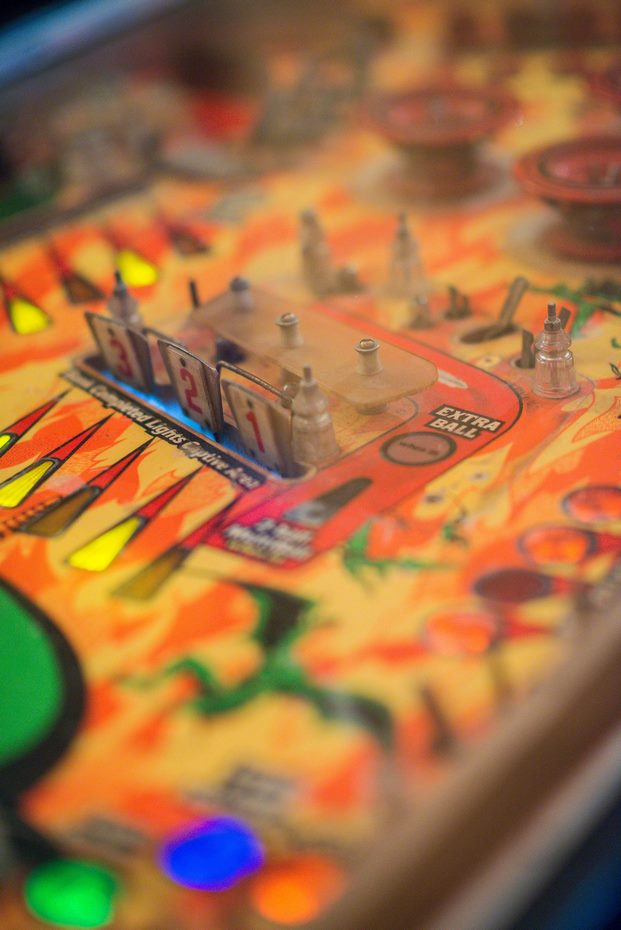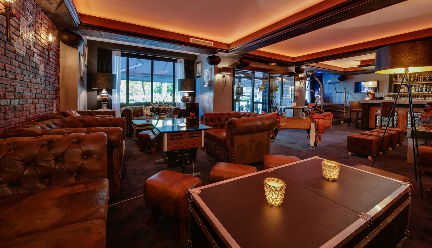 Nous avons chiné une borne arcade de jeu, une table flipper, un vieux coffre fort, une table Jeutel très rare et créé différents tabourets et cheval d’arçon munis de selles d’équitation.