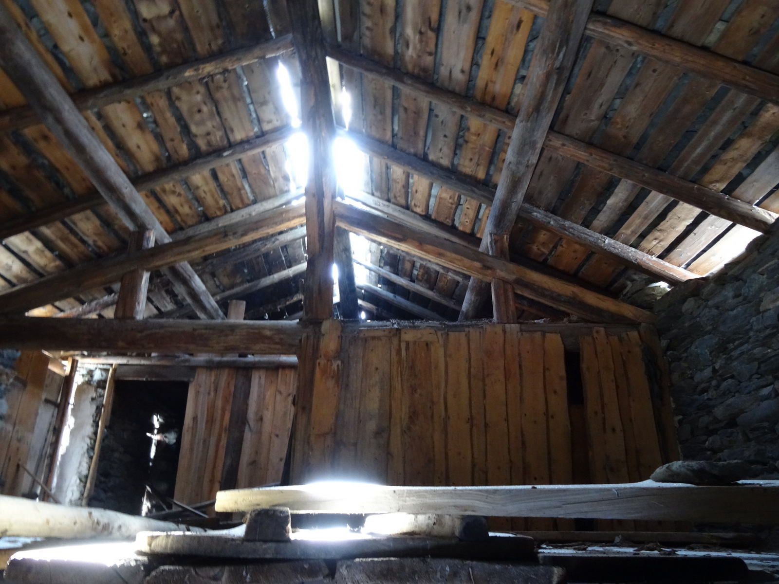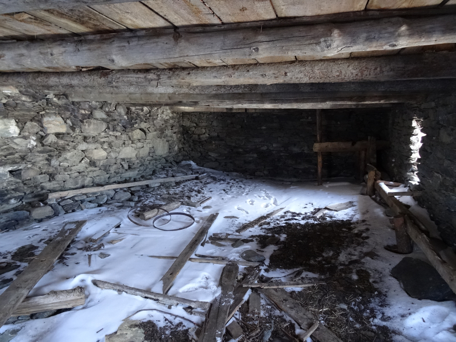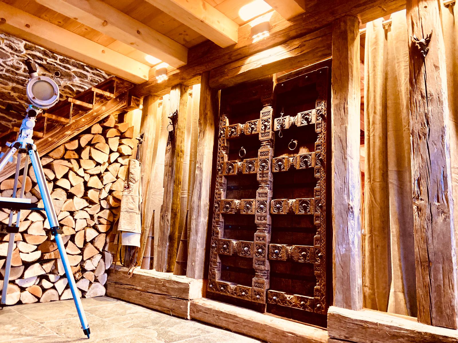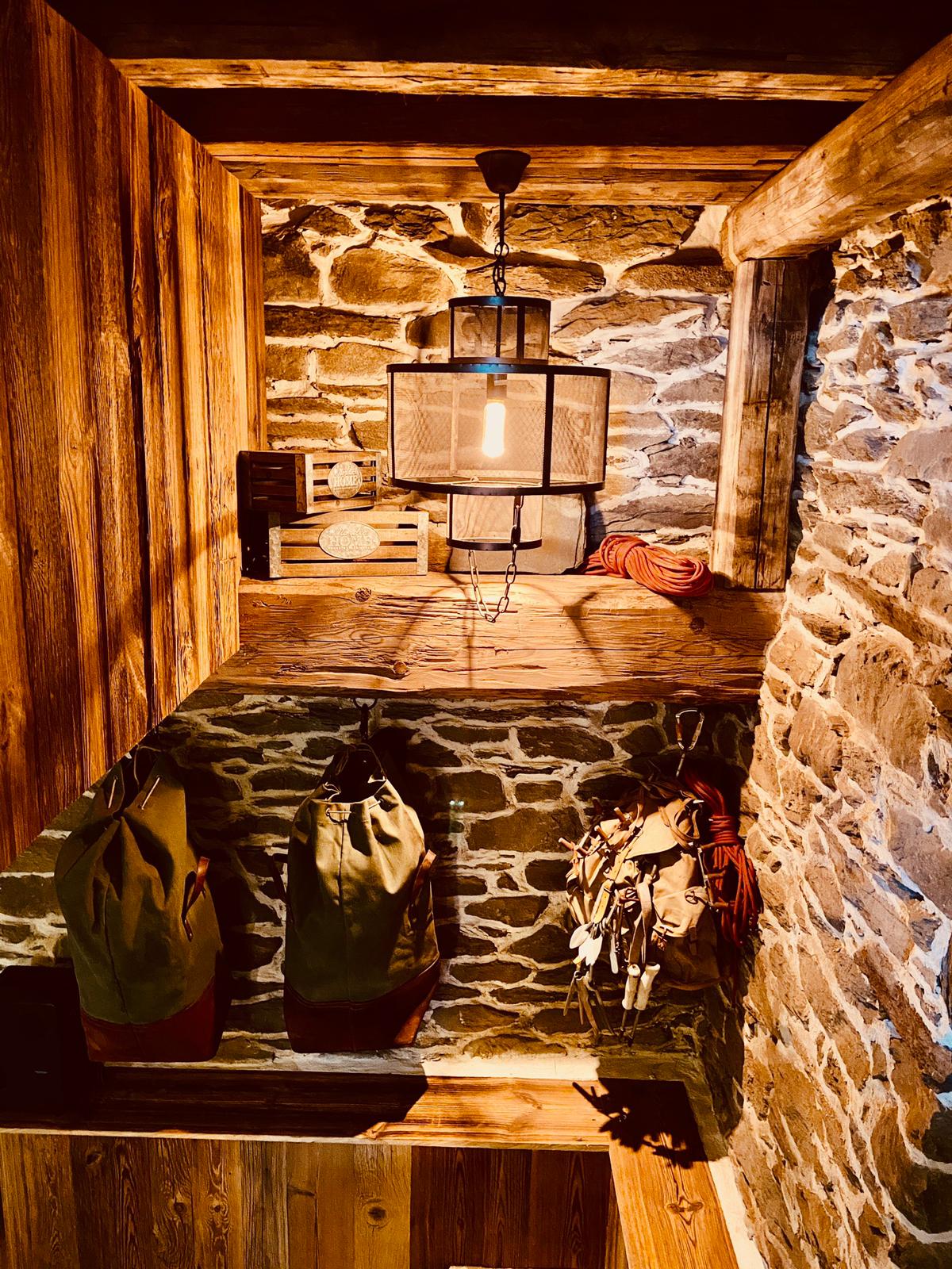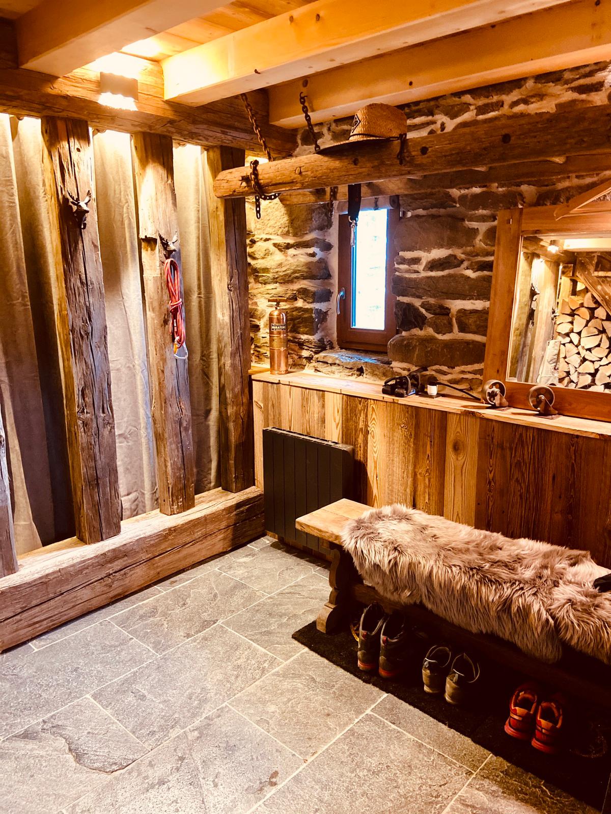 Sur les deux niveaux initialement prévus pour les animaux et les bergers nous avons créé au RDC un espace entrée permettant de stocker du bois, matériel de ski ainsi qu’un dortoir, séparé par une cloison ajourée en poutres et rideaux rétroéclairés en led, de 4 lits et espace de travail ou détente. La porte d’accès tout droit arrivée de Dehli en Inde fut du meilleur effet. En demi-niveau la pièce fût divisée en deux avec un local technique accessible depuis l’extérieur et une salle de bain au confort moderne avec l’eau chaude générée par le puisage et la chaudière à gaz installée.