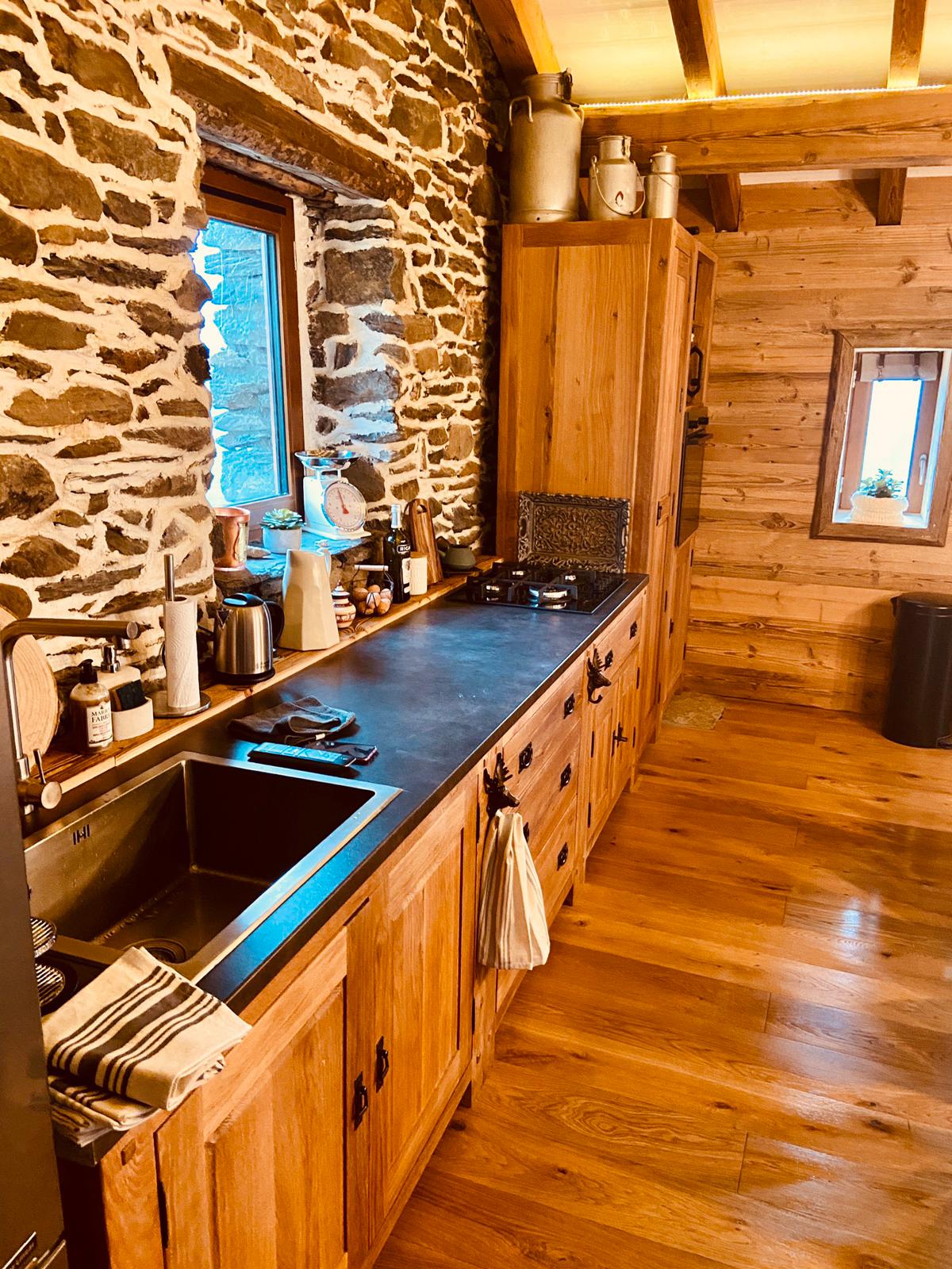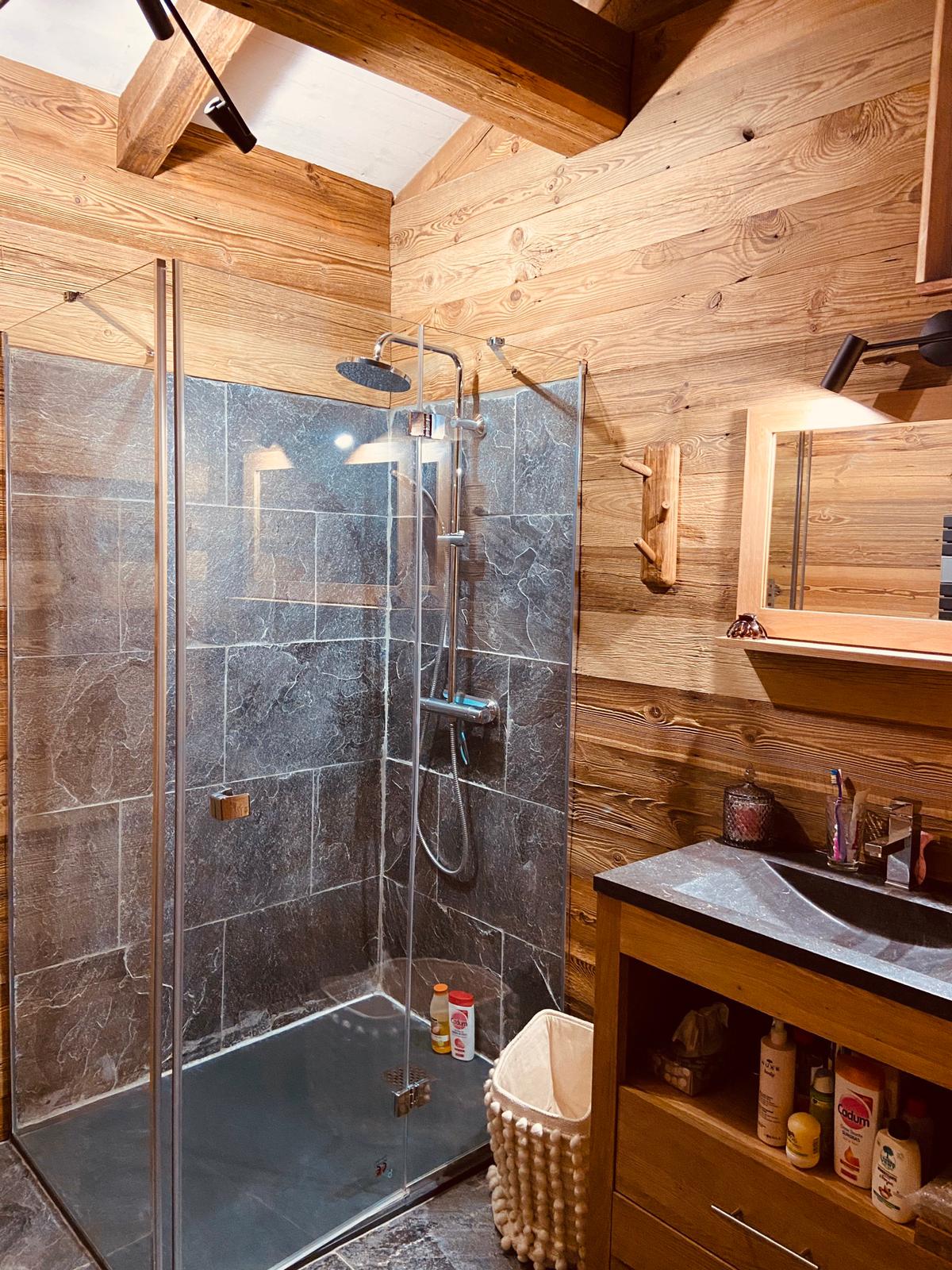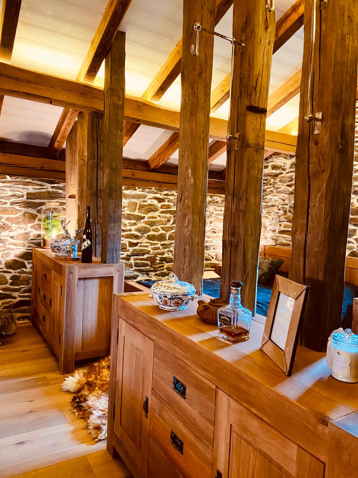 Pour l’intérieur, le choix évident de matériaux de nos montagnes fut la seule option. Les revêtements allèrent de bardage en vieux bois, sols en pierre naturelle (utilisée également pour la douche), parquet à base de chêne, poutres déco et charpente en vieux bois.