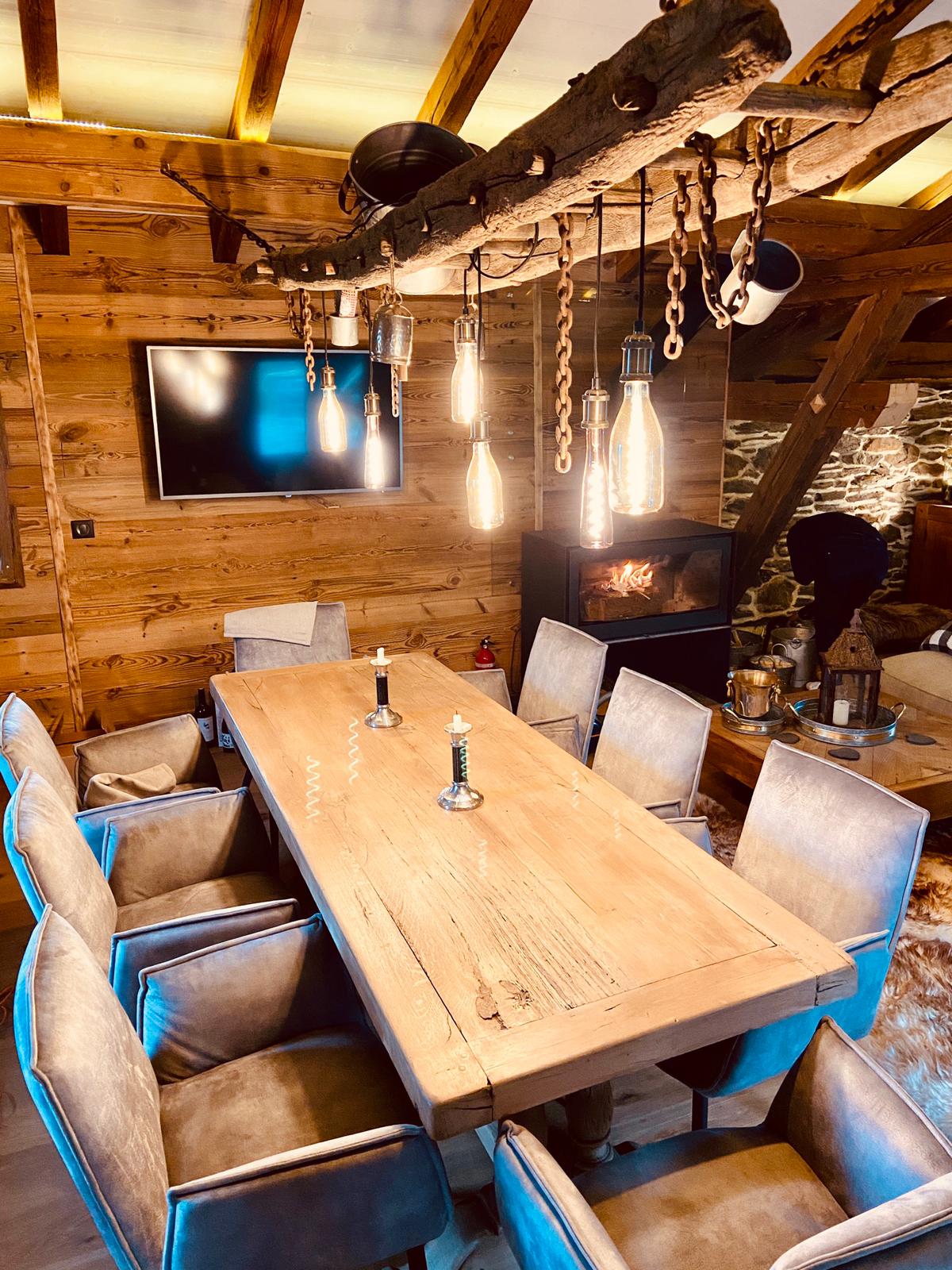 Pour le premier étage, rejoignant la terrasse du haut nous aménageâmes une pièce ouverte, pour une meilleure diffusion de la chaleur, une cuisine, un salon, une salle à manger et la master room avec son petit salon de lecture en mezzanine. Pour la partie charpente un éclairage led le long des poutres rehausse la qualité de l’ouvrage. Comme dans l’espace entrée, un détournement d’échelles centenaires nous servirent de support d’accrochage en bas et de lustre de salle à mange sur la table monastère en haut, le tout chinés par nos soins.
