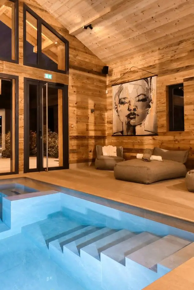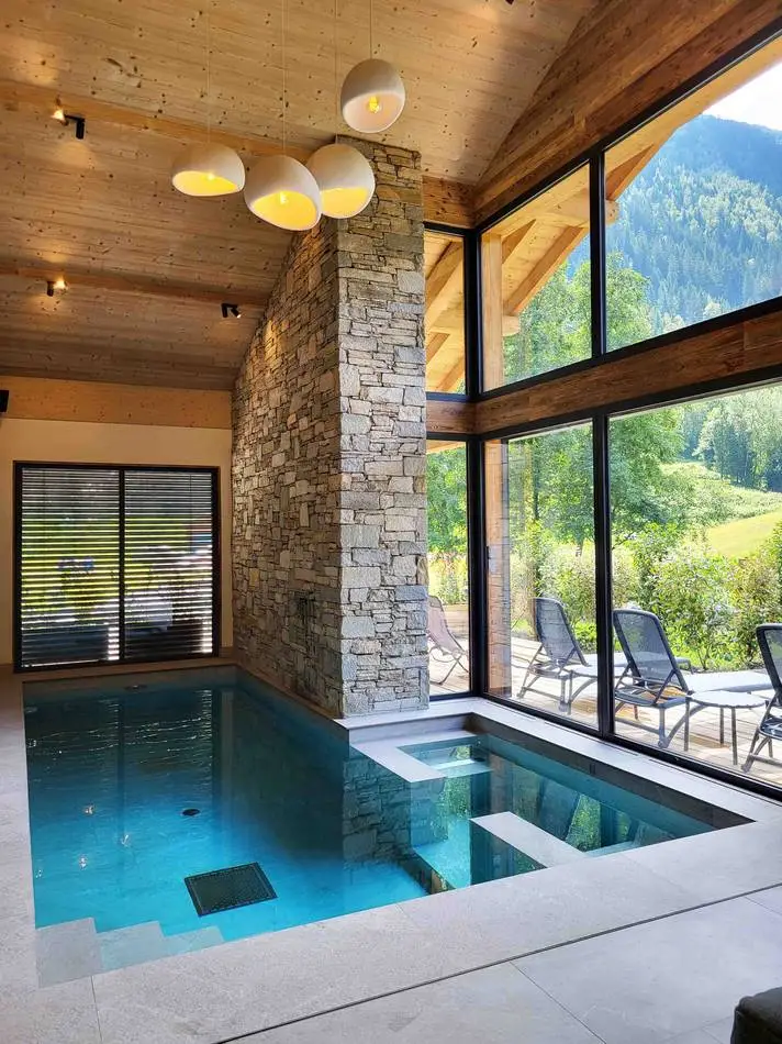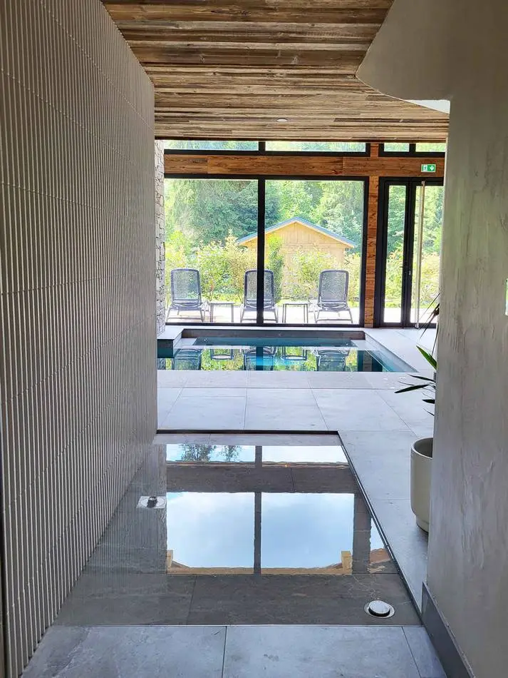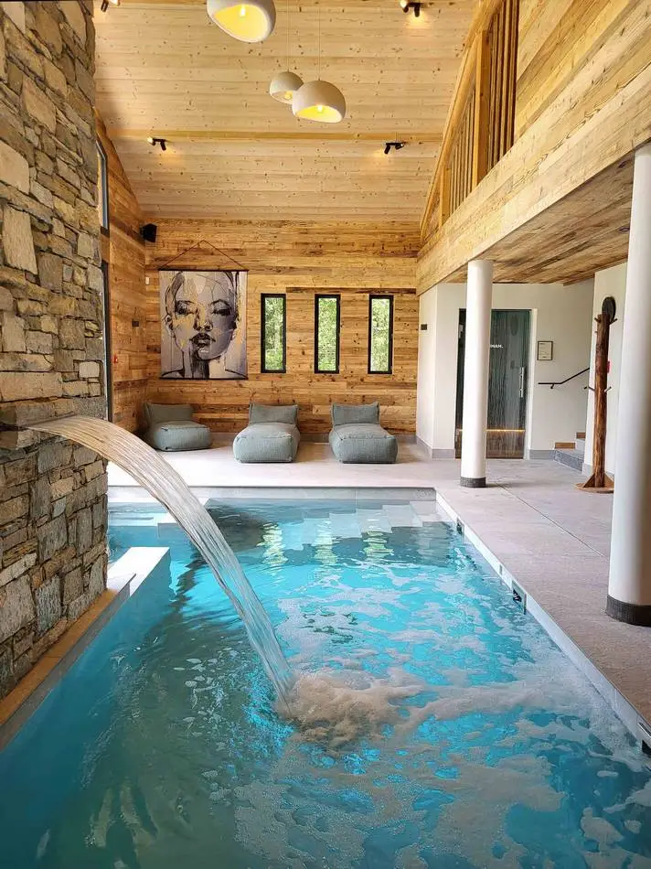 En écho, le spa « Eaux Ma Biche » prolonge cette immersion dans une atmosphère apaisée et minérale. Ici, l’architecture intérieure se fait plus silencieuse : lignes épurées, matières naturelles, jeux de vapeur et de reflets. Le parcours sensoriel – sauna, hammam, bassin, douches – s’inscrit dans une mise en scène douce où l’eau et la lumière dialoguent avec le paysage.