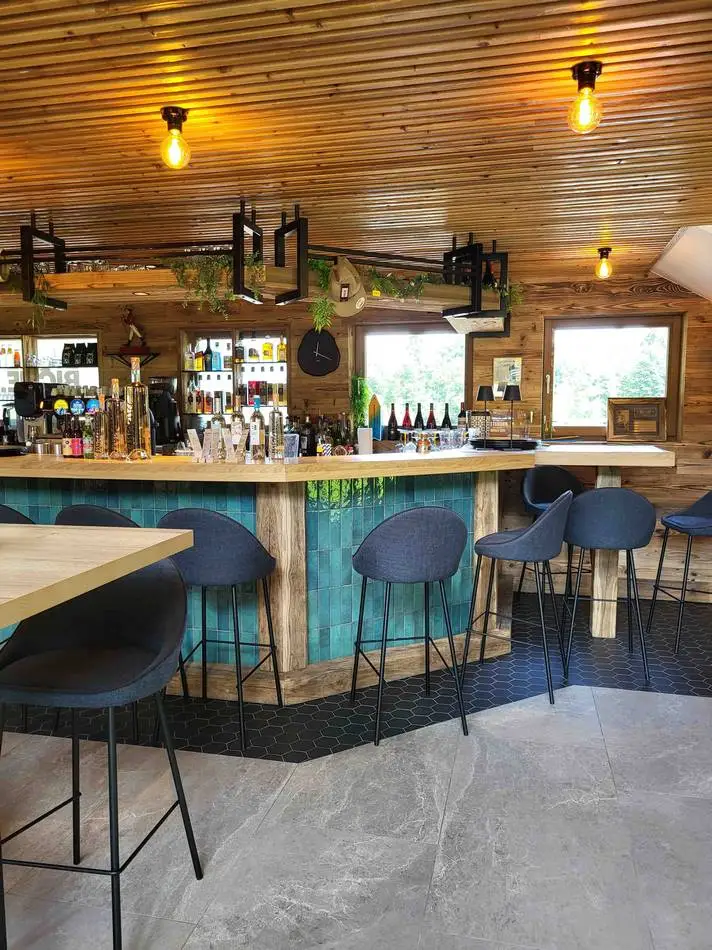 Ici, les codes traditionnels sont réinterprétés avec subtilité : le bois, omniprésent, structure l’espace tandis que les matières textiles et les teintes profondes viennent adoucir l’ensemble. Loin du folklore, l’ambiance se veut authentique mais épurée, presque instinctive.